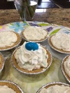 I purchased the Keebler Ready Crust 9 Inch Mini Graham Pie Crust, 6 count (Pack of 12) and used that. If you want to make the crust at home– buy a box of graham crackers, crush up about 6 graham crackers and add 2 tbs. of melted butter, mix it all together. Then, spoon the mixture into the bottom of your little cups and press down.
