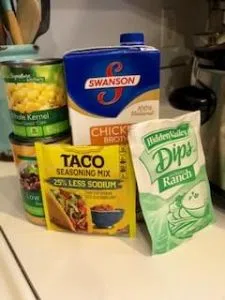I use 3-4 chicken breasts- put in the crock pot, top with a packet of taco seasoning (I use low-sodium), and then a packet of ranch seasoning. Then, pour in 2 cups of low-sodium chicken broth over everything. Set your crock pot on low for 4-6 hours.