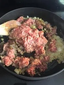 Start by using a large pan, heat olive oil over medium heat and cook onions until soft. Add minced garlic and cook about 1 minute. Add ground sausage and cook until the sausage is browned. Then, drain grease.