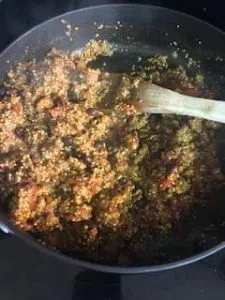 Add black beans, tomatoes, oregano and salt and pepper. Add uncooked quinoa and chicken stock to the pot and stir well. Allow the mixture to cook together until the quinoa is completely cooked– about 20 minutes. Your mixture will be thick but juicy.