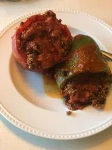 Scoop the sausage quinoa mixture and pour it into the hollow peppers, making sure to fill the peppers completely but allowing the mixture and juice to spill over the sides. Once all peppers are filled, pour remaining juice into the bottom of your pan or Dutch Oven. Put the pan into the pre-heated oven and cook for approximately 30 minutes or until the peppers are tender.