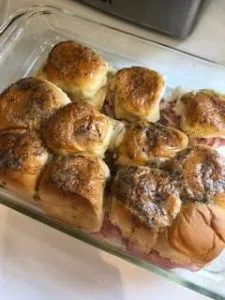 Grab a 9×13 pan and a large pack of rolls. Take a bread knife and cut the rolls in half horizontally, place the bottoms in the pan. Place ham on the bread, I normally do 2 slices, then add swiss cheese. The cheese you may have to cut into smaller squares to fit on the sandwiches better. Then, place the tops of the rolls back on the sandwiches.