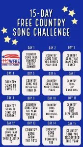 Something to help you keep busy but also use your brain during our stay at home order. The 15-Day Free Country Song Challenge! Time to let your music knowledge shine! Look out for social media posts on Instagram and Facebook like these to get started: