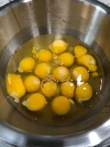 I started out with 12 eggs in a large mixing bowl, adding 2 cups of milk and then any chopped vegetables you have on hand (I used a tomato and onion). Add salt and pepper then whisk everything together.