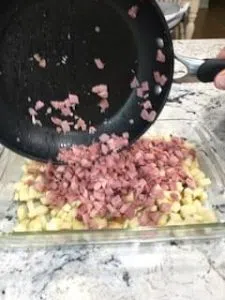 Using a 9×13 baking dish (grease the pan)….peel and chop up potatoes (I used 4 medium sized) into small cubes and laid them on the bottom of the dish spread evenly. Then, cube your ham. You can use about 2 cups; I definitely used double that and it was perfect.