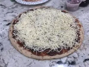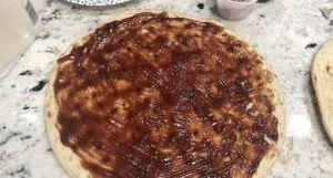 SUPER easy… Spread 1/4 cup of your favorite BBQ sauce over the dough leaving 1/2 in. bare in from the edges. Then, sprinkle mozzarella cheese and smoked Gouda cheese on top (about 2/3 cup each). I only had Mozzarella, so I just used that.