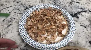Chop up your cooked chicken, (you can use rotisserie, or baked chicken) I had grilled chicken that I purchased from the store, then toss lightly in BBQ sauce and toss on top of the cheese.