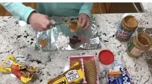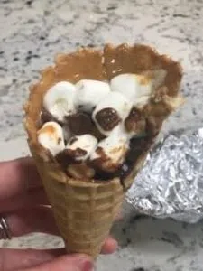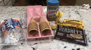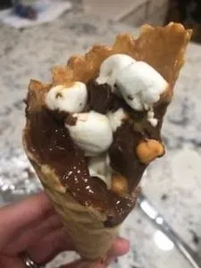 Start our with an ice cream cone. We used waffle cones- take peanut butter and spread it around the inside of the cone, then stuff your cone with marshmallows (the mini marshmallows seem to work best so you can fit other ingredients), chocolate and literally any other topping you might want to add.