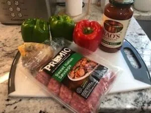 You can either use a can of crushed tomatoes, then season with pepper, salt, basil, and garlic powder OR you can you a jar of your favorite red sauce and pour it over top of the peppers and onion.