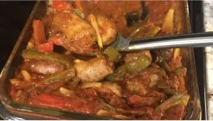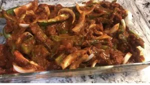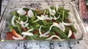 I started out chopping three peppers (2 green, 1 red) and slicing an onion. Lay the vegetables in the bottom of a 9×13 glass dish.