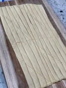 Using a pizza cutter, cut the rectangle lengthwise into strips. If adding cheese, cut that into thin strips, too.