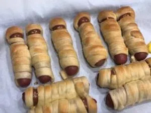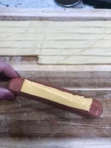 Wrap pieces of dough around each hot dog to look like “bandages” leaving a little room at the top for the “face.” If adding cheese, lay that down on the hot dog and wrap dough around it.