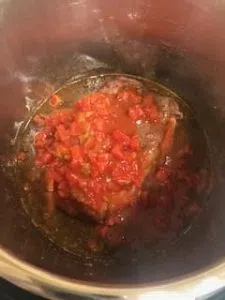 Pour 1/2 cup of chicken or beef broth into the pot and scrape the bottom to remove any stuck bits. Then, put the roast back into the pot. Add crushed or diced tomatoes (14oz can), two bay leaves, and the rest of your seasoning mix.