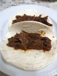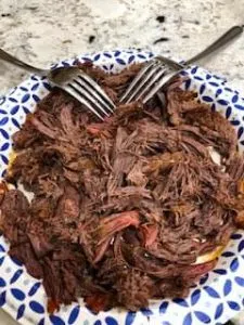 Remove the chuck roast and shred with two forks. With a spoon, skim the fat off of the top of your juices and put your pot back on sauté mode and let the juice simmer for 10 minutes to reduce. Put your shredded beef back into the pot and let it soak for few minutes before serving over rice or in tacos with cheese!