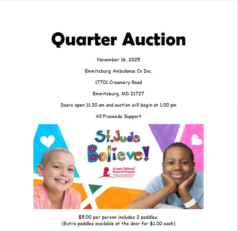 Quarter Auction for St. Jude Children’s Research Hospital November 16, 2025 11:00 am - November 16, 2025 3:00 pm Add to my calendar image/svg+xmlOutlook Calendar Google Calendar Yahoo! Calendar image/svg+xmlApple LogoiCal Calendar