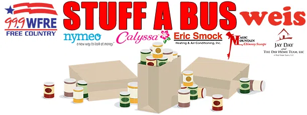 99.9 WFRE & WEIS Markets invite you to stop by and help us Stuff-A-Bus with Calyssa Travel! All food collected will support the Frederick County Food Bank!